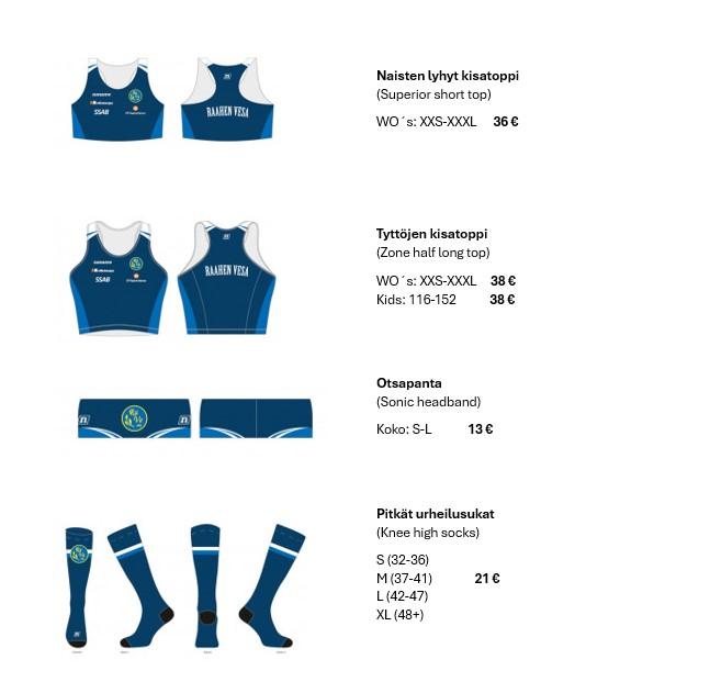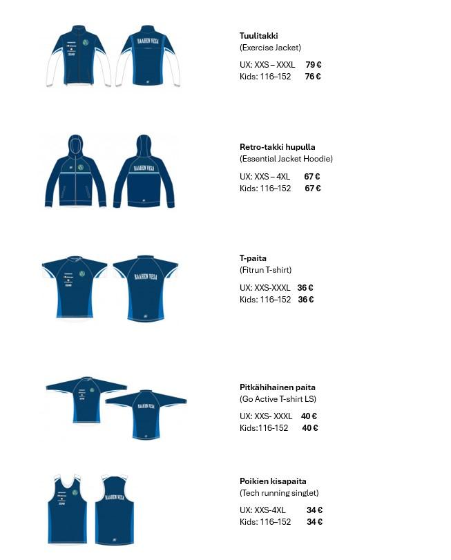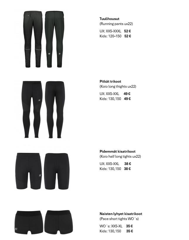 Tilattavana tutut: tuulitakki, otsapanta, t-paita ja kisatoppi ja -paidat. Lisäksi pitkähihainen paita, retro-takki, running pants sekä pitkät trikoot.